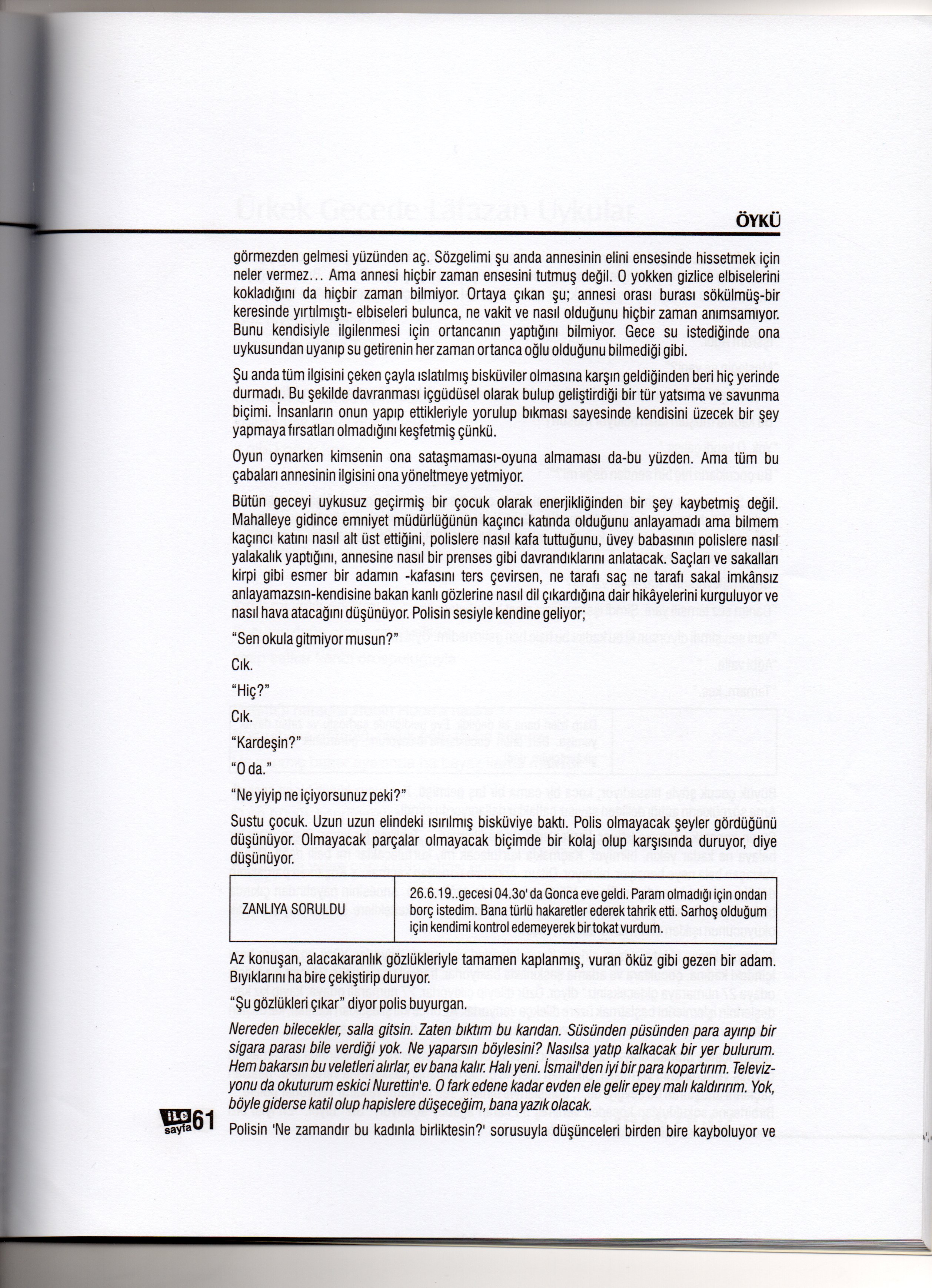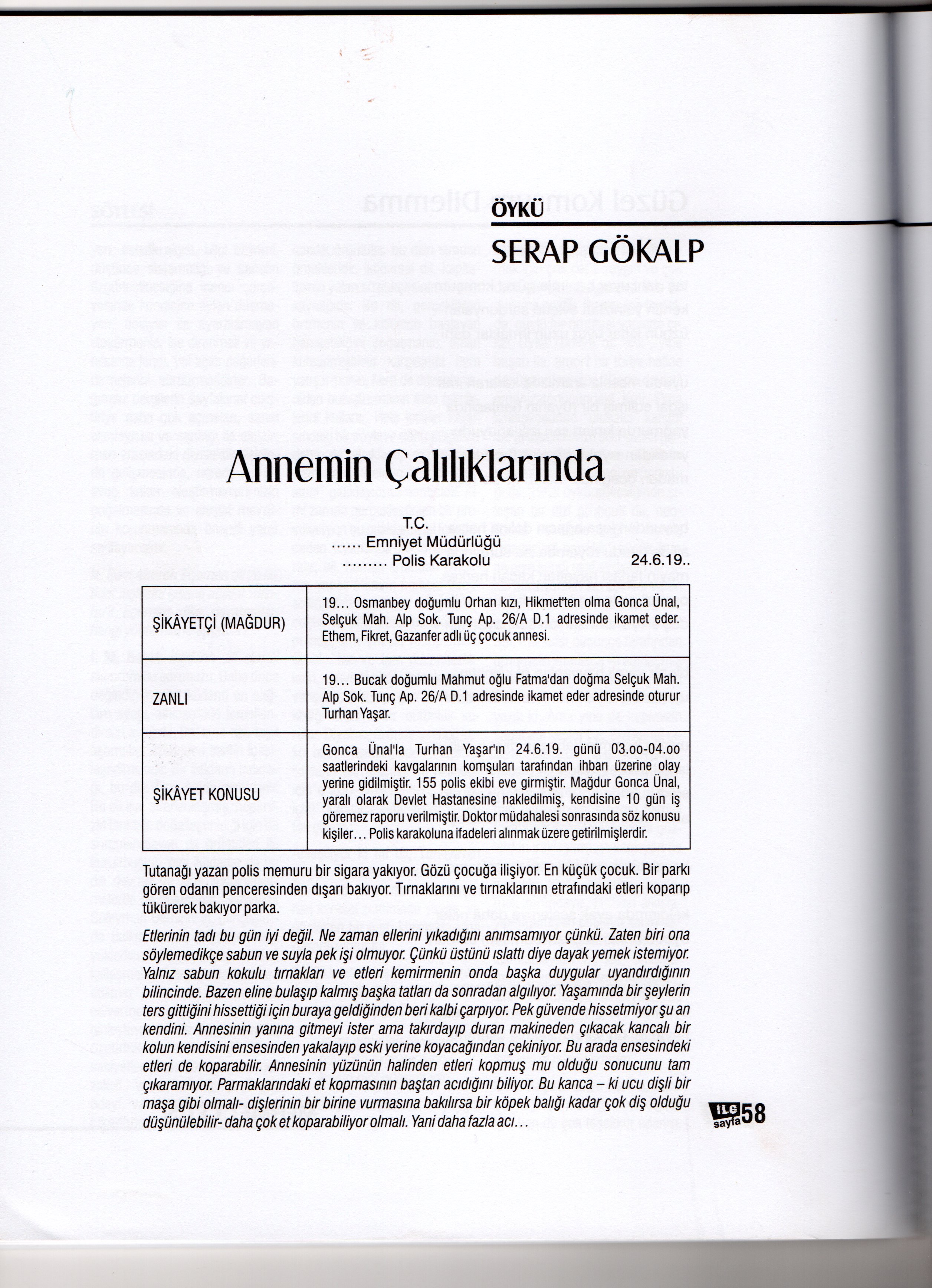 İlk anda bir kadının dayaktan şikayeti görünümündeki olay, tutanak yazıldıkça ve öykü ilerledikçe farklı bir dramı okura aktarır. Çocukların gözü önünde gerçekleşen olay zaman zaman onların düşüncelerine ve anlatımlarına de yer vererek tamamlanıyor. Finali ise şöyledir: “Yaşam içinde oradan oraya savrulan çocuklarsa besbelli annelerinin çalılıklarında barınmaktan bezmiş ve kararlarını vermişler. Dikenleri ellerine batan düşlerini başkalarına verecekler. Yalazları saçlarını tutuşturan bu sevgiyi de…gülüşleriyle birlikte; sen tut demeye karar veriyorlar polise… Birbirlerine sokuldukları köşeden verilmiş bu kararı ağabey açıklıyor: “ siz” diyor. “en iyisi bizi çocuk yurduna gönderin. Annem bizi istemiyor.”