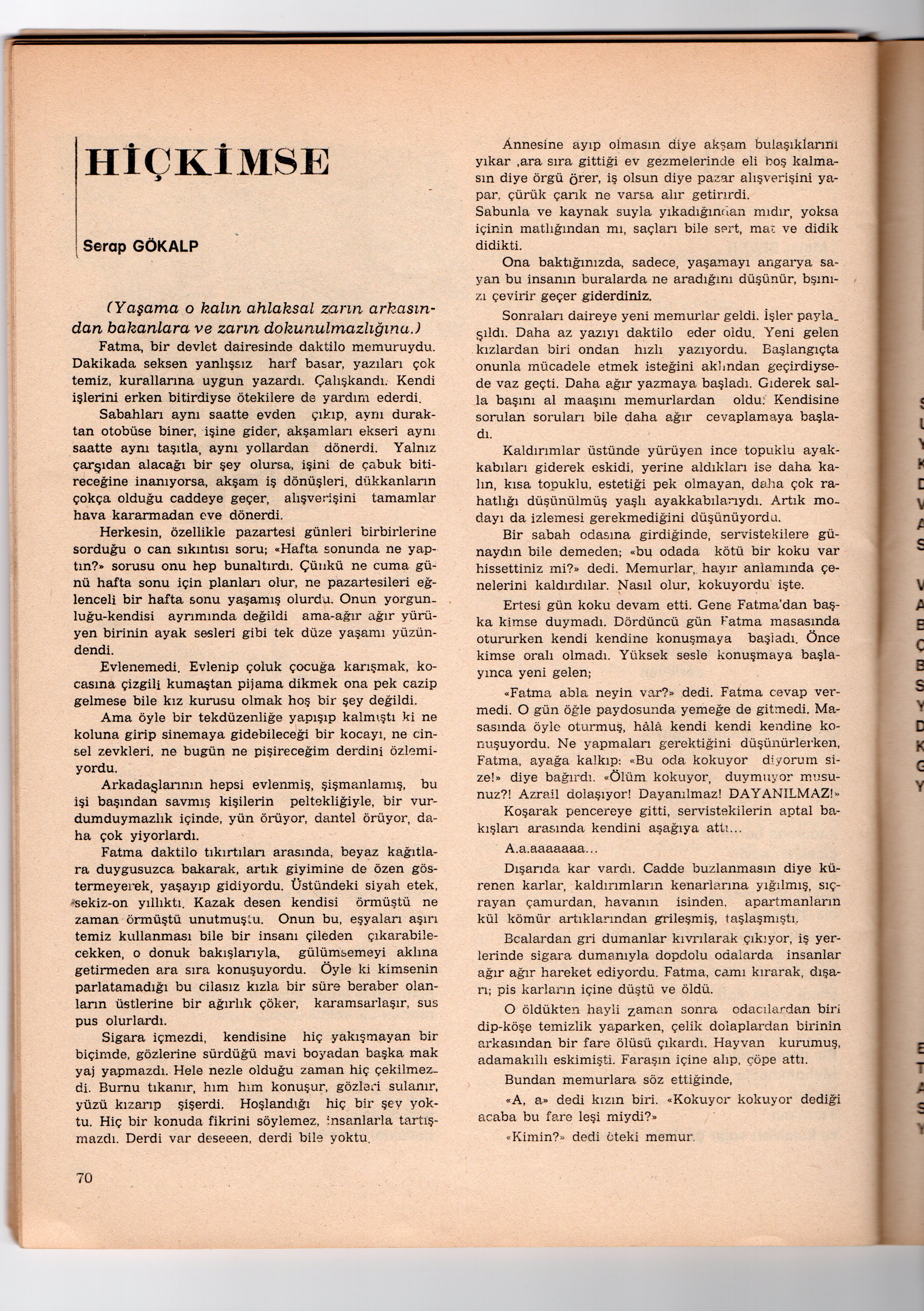 Büyüdüm, çalışmaya başladım. “Nalan çeyiz hazırlamaya başlamış, bizim kız ilk maaşıyla daktilo aldı,” diyen annemdi. “Ne olacaksın başımıza yazar mı olacaksın?” Bu da babam. Artık gizli yazmalar bitmişti. Dergilerde yazılarım çıkıyordu çünkü. Gelin görün ki devlet memurluğu yaptığım için takma isimle yazmam gerekiyordu. Düşünün yazar olmaya çalışıyorsunuz ama adınızı gizlemek zorundasınız. Devlet düzeneği kalemden korkar bu ülkede…