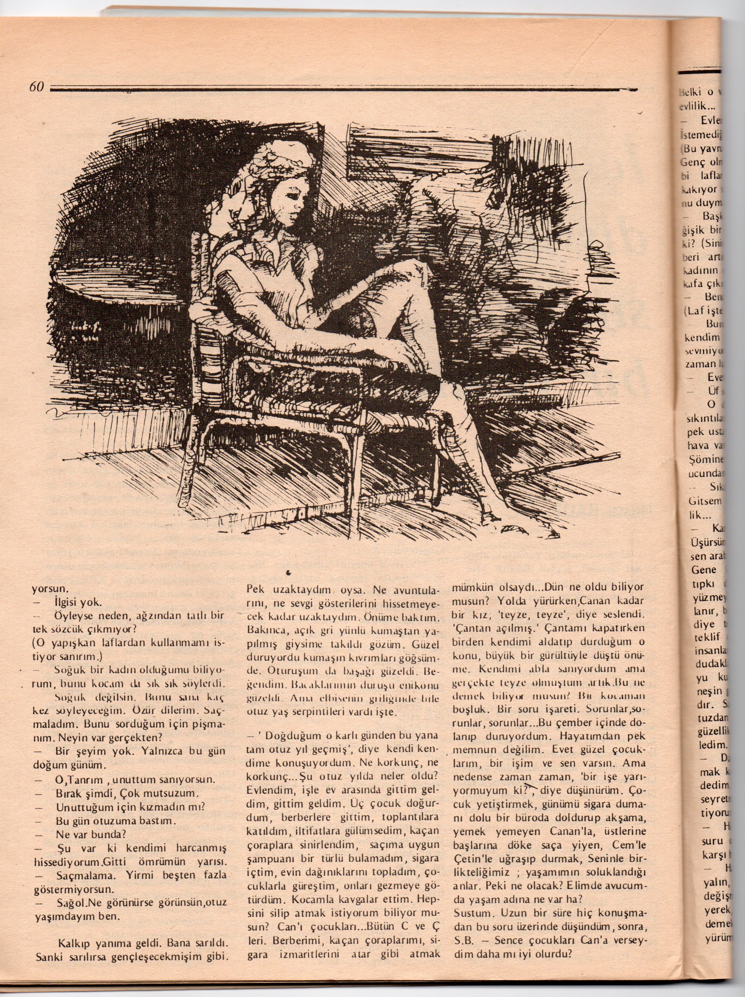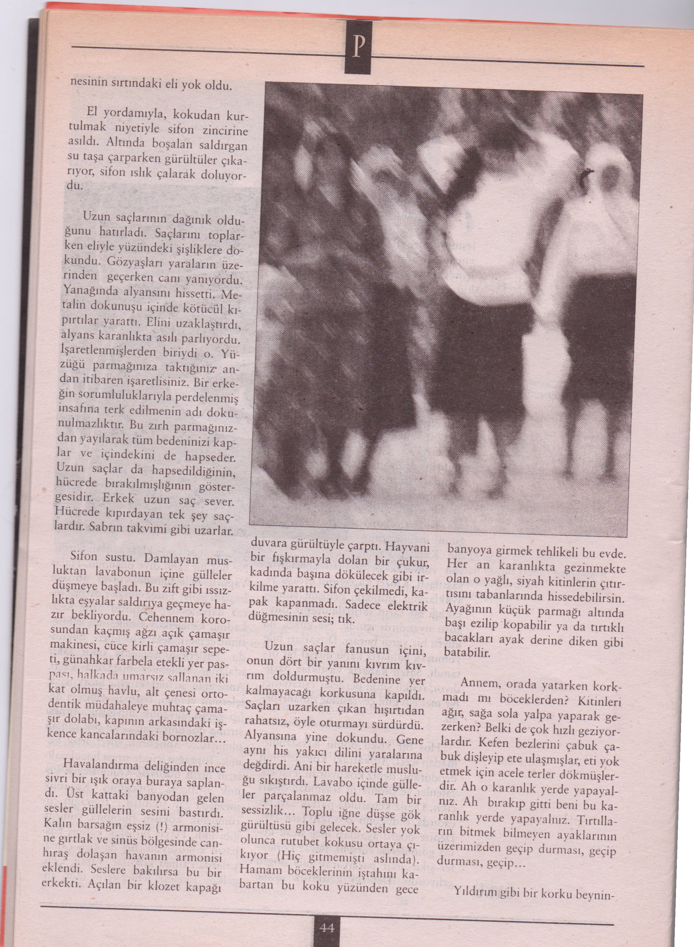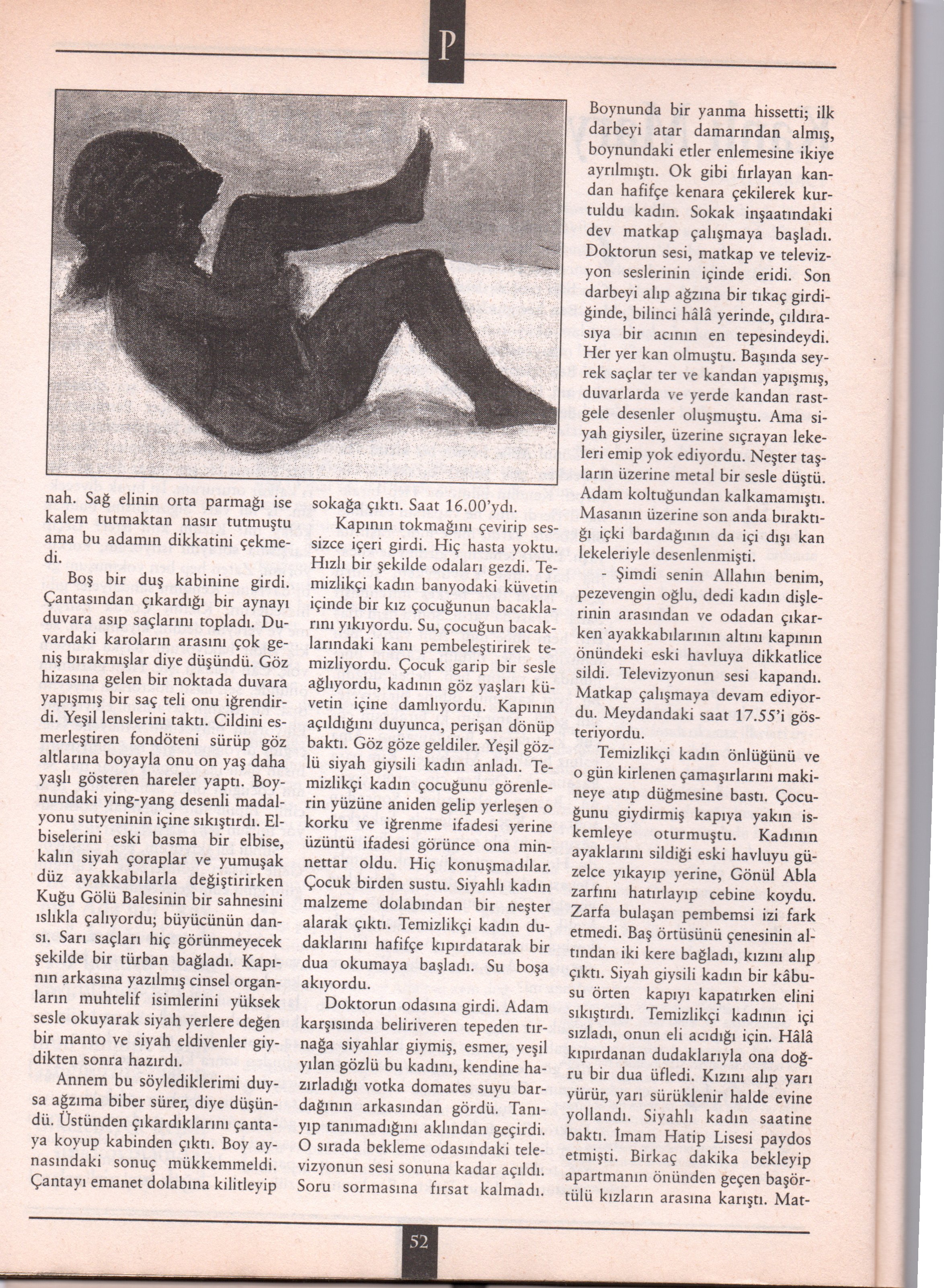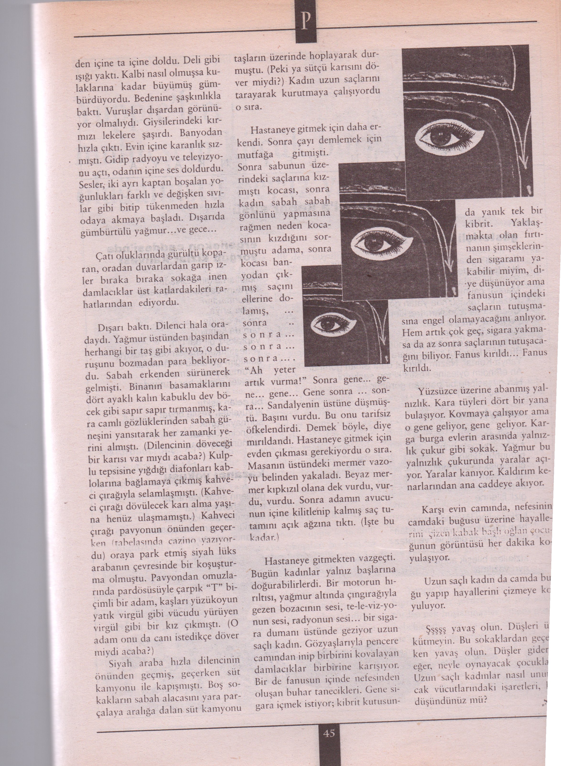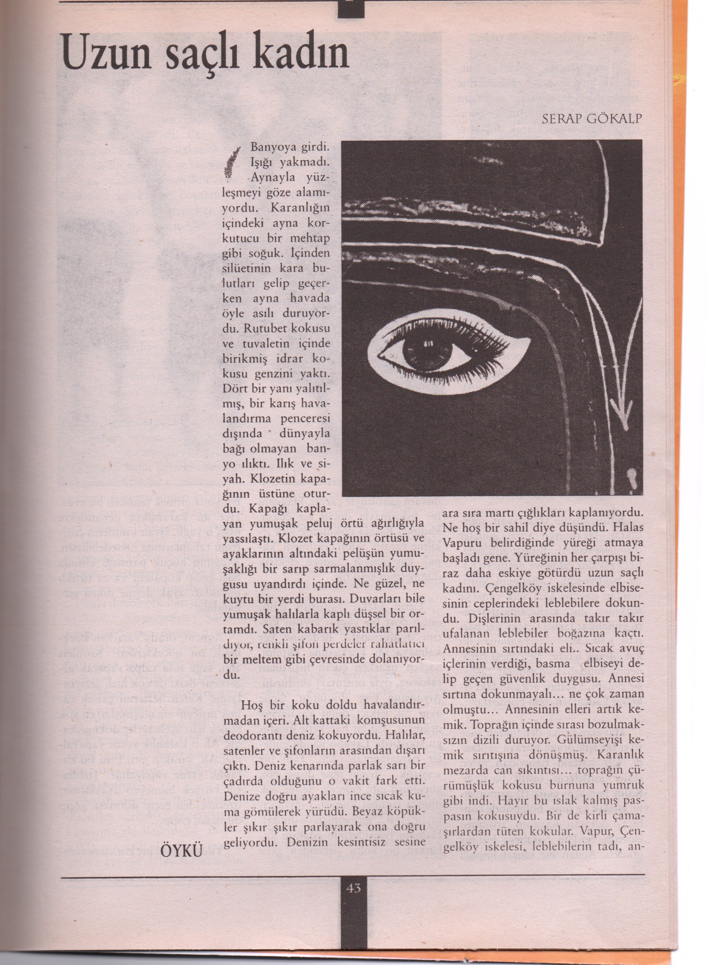 Papirus’ta 2001 yılının Mayıs 51.sayısında Uzun Saçlı Kadın öyküm var. Bir de üstelik öyküye özel desenler ekleyerek, bana jest yapmışlar. Bu sayıda iki öyküye yer verilmiş biri Jack London’un Yuvarlanan Taş Yosun Tutmaz, öyküsü ve benim Uzun Saçlı Kadın öyküm. Kocası tarafından sürekli dövülen, bunu yıllarca sineye çeken öykü kahramanı banyoya sığınır. Çünkü hem evliliği hem yaşamı hem de az önce olanları değerlendirmesi gerekir. Işığı yakmaz. Öykü tümüyle karanlık banyoda geçer. Bu nedenle kulak algısı yoğun bir metindir. Olup bitenleri düşünen karakterin şiddet dolu kurtuluş eylemiyle biter.