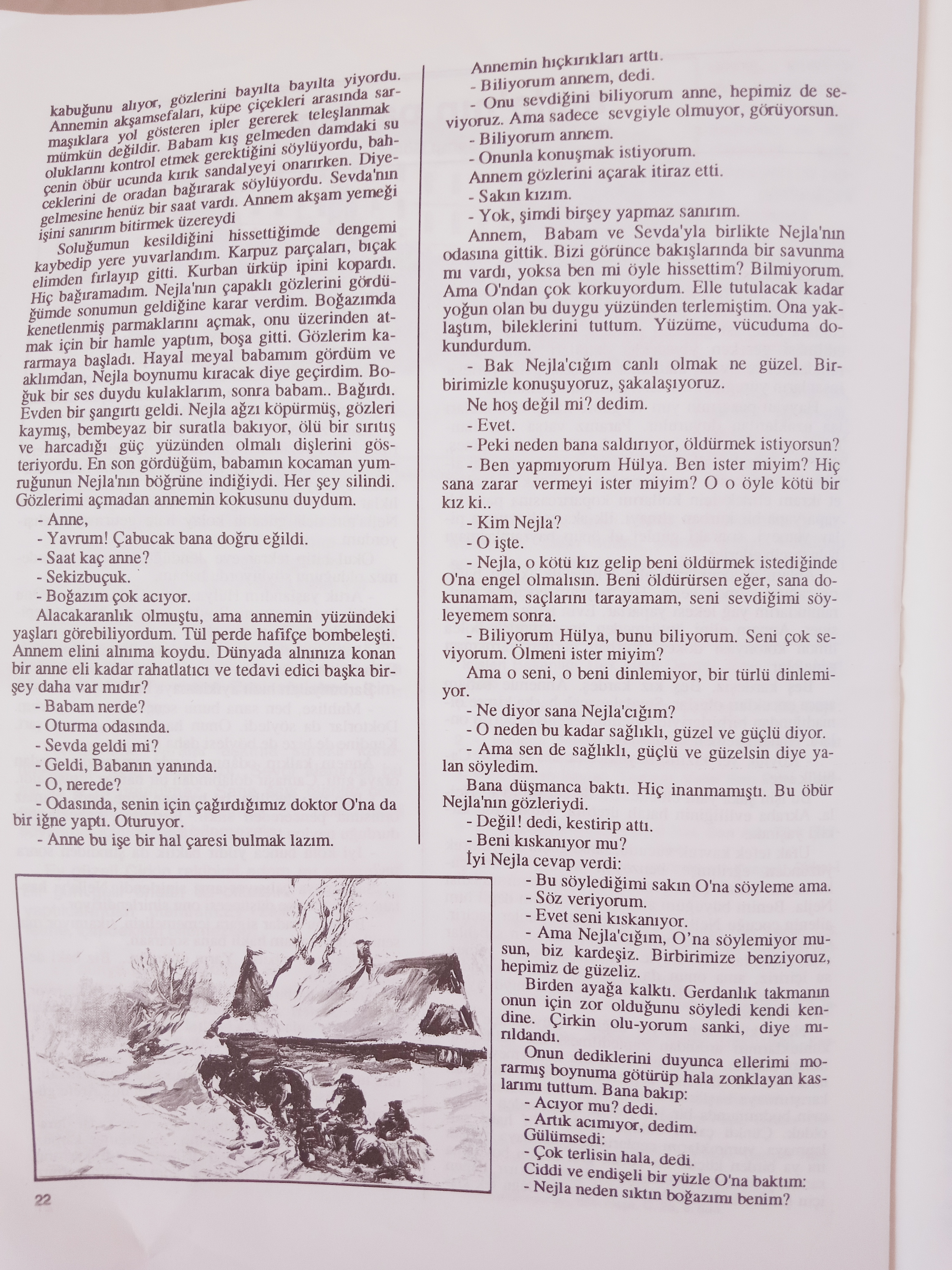 (…) İpi koptu, boynunu büküp sarsıla sarsıla kaydı uçurtmam. Asırlık bir çınarın en üst dallarında çarmıha gerildi. Koşarken düştüm, başımı yardım, sigara külü bastılar yaraya, ninem okuyup üfledi, nazar oldum diye. Üfleme bana nine, üfleme öyle ölecekmişim gibi. Yapma ne olur korkuyorum…”