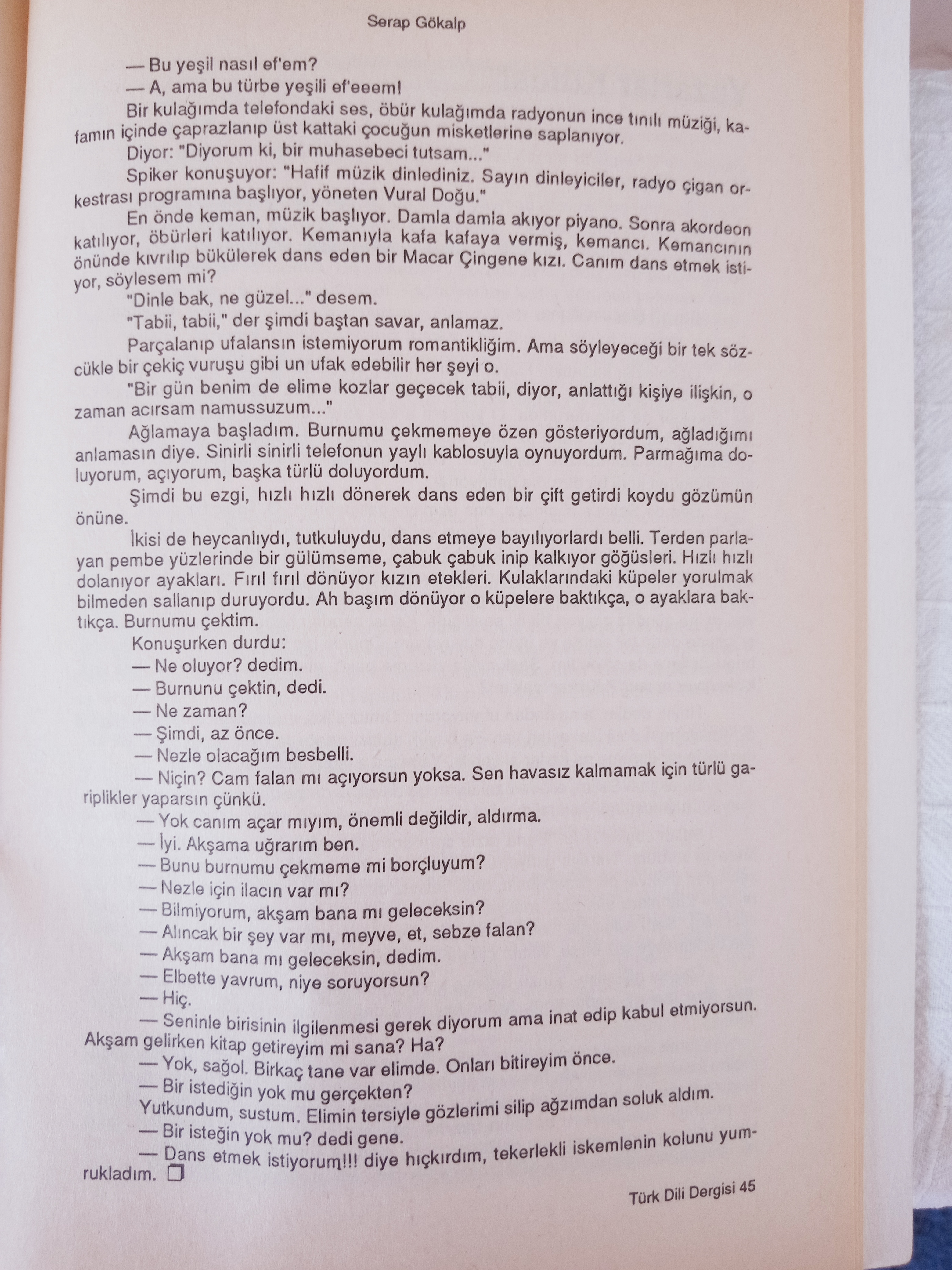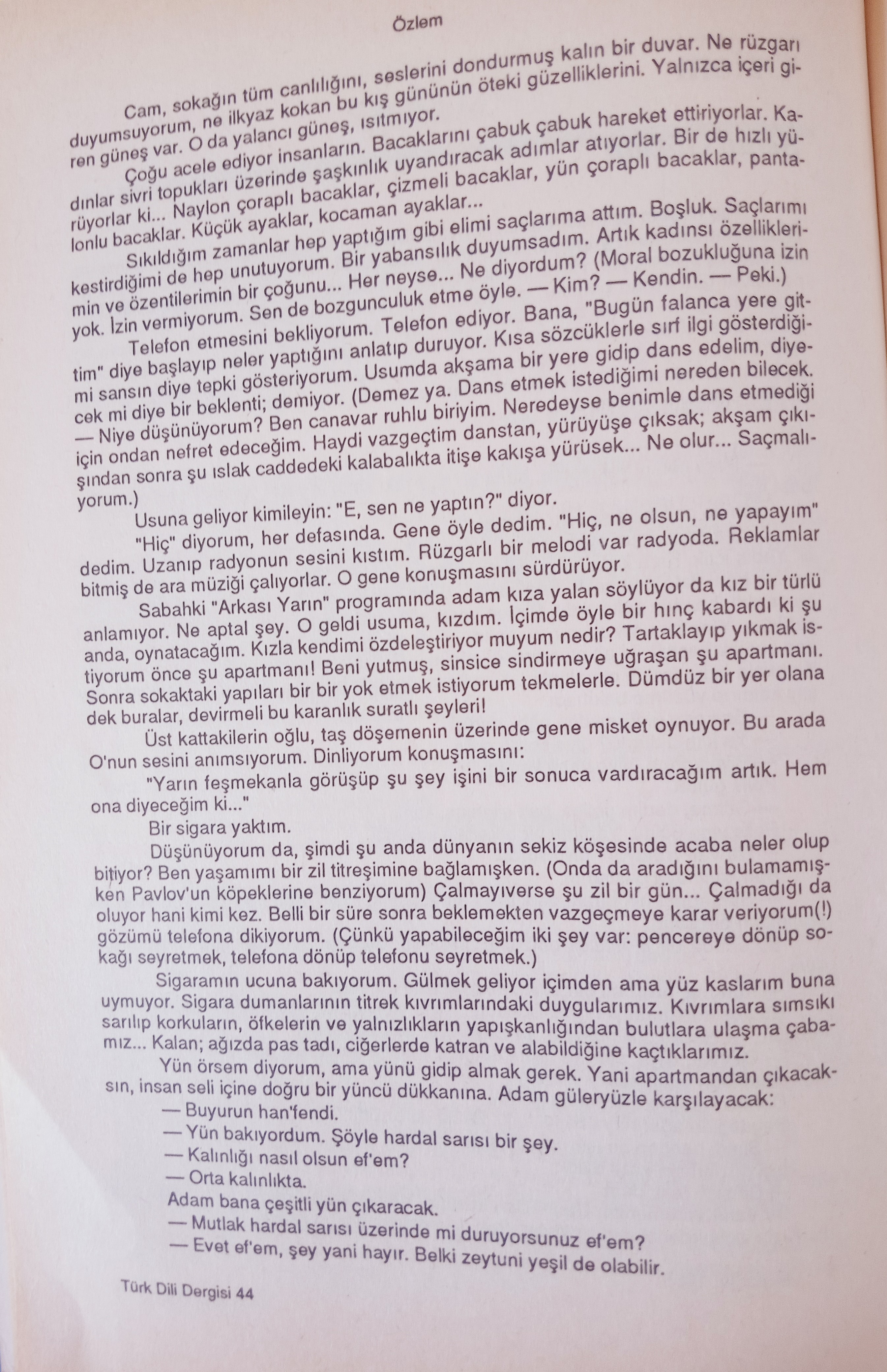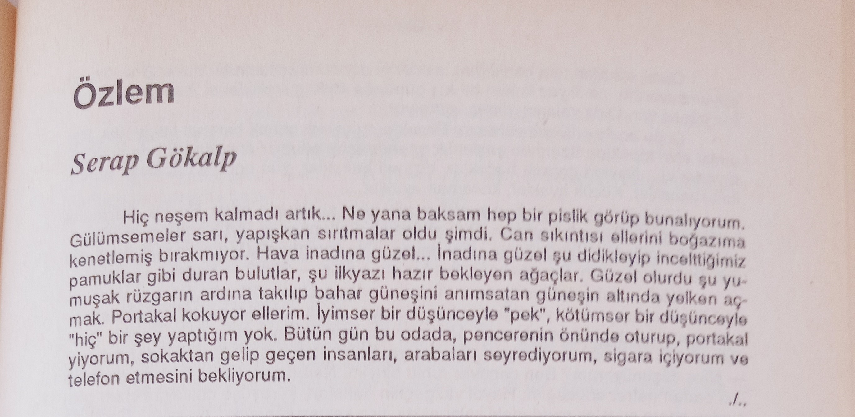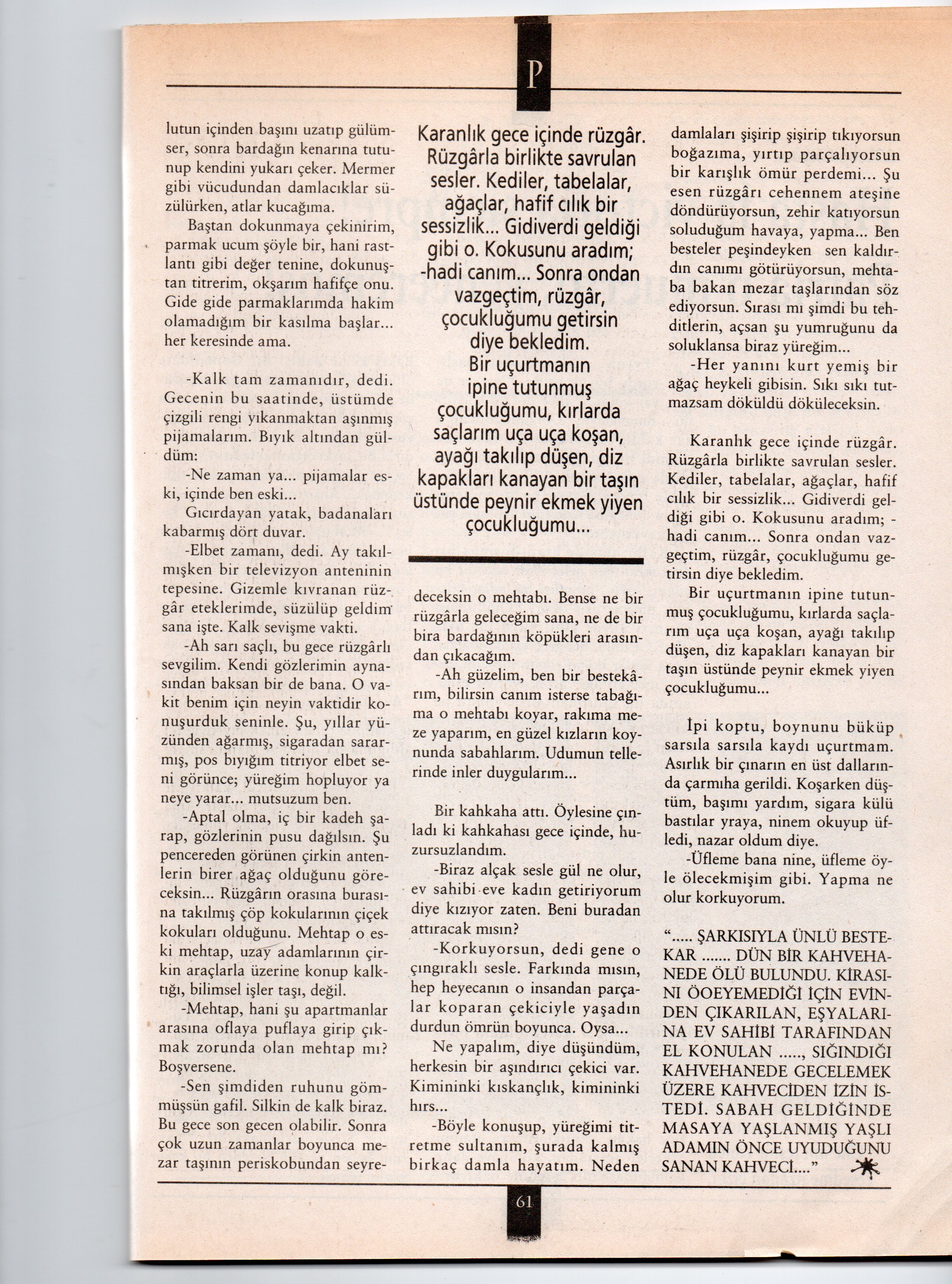 “Karanlık gecede rüzgâr. Rüzgârla savrulan sesler, kediler, tabelalar, ağaçlar yer yer sessizlik…. Gidiverdi geldiği gibi o. Kokusunu aradım, hadi canım, sonra ondan vazgeçtim. Rüzgâr çocukluğumu getirsin diye bekledim. Bir uçurtmanın ipine tutulmuş çocukluğumu, kırlarda saçlarım uça uça koşan ayağı takılıp düşen, diz kapakları kanayan, bir taşın üstünde peynir ekmek yiyen çocukluğumu…