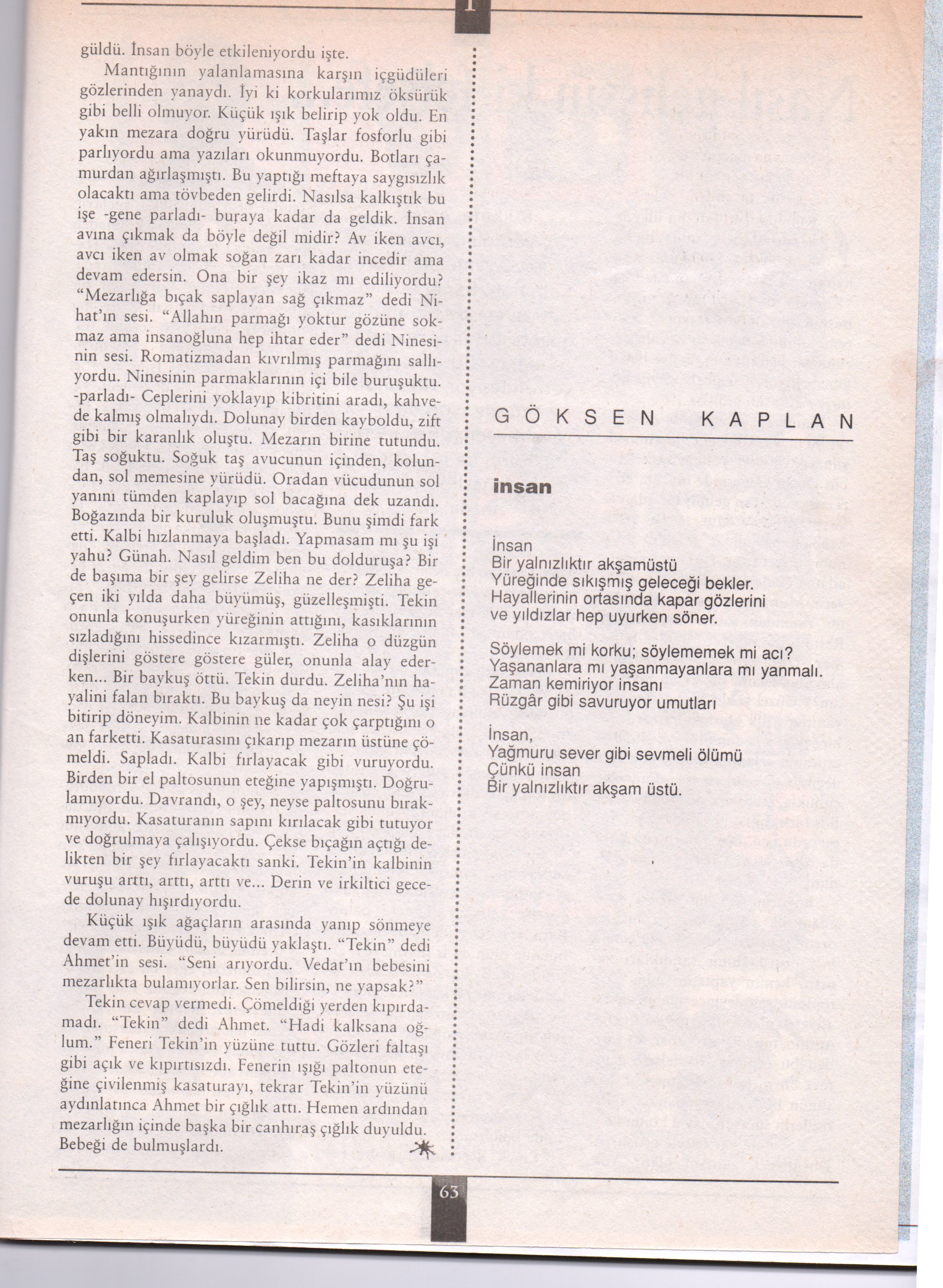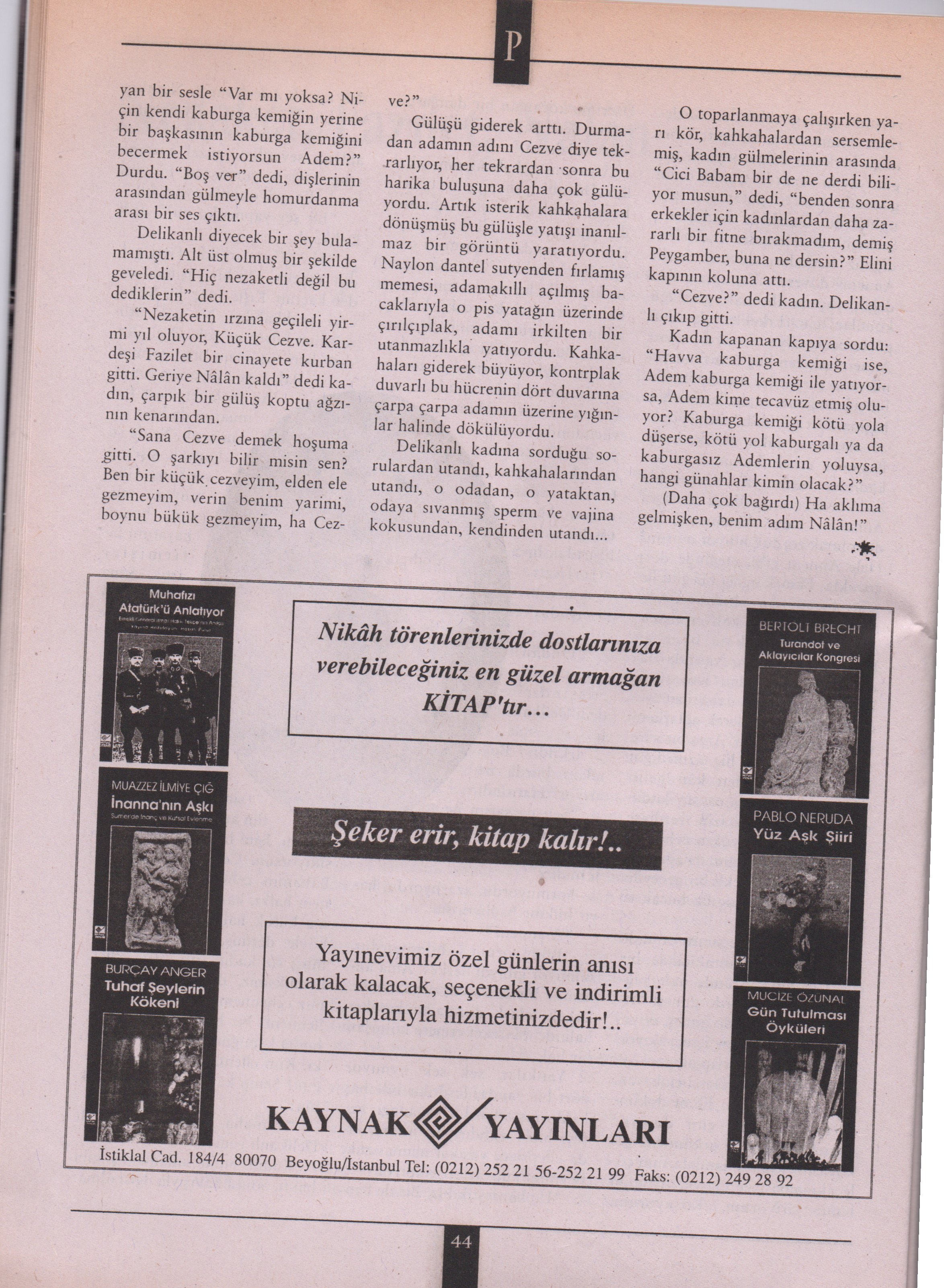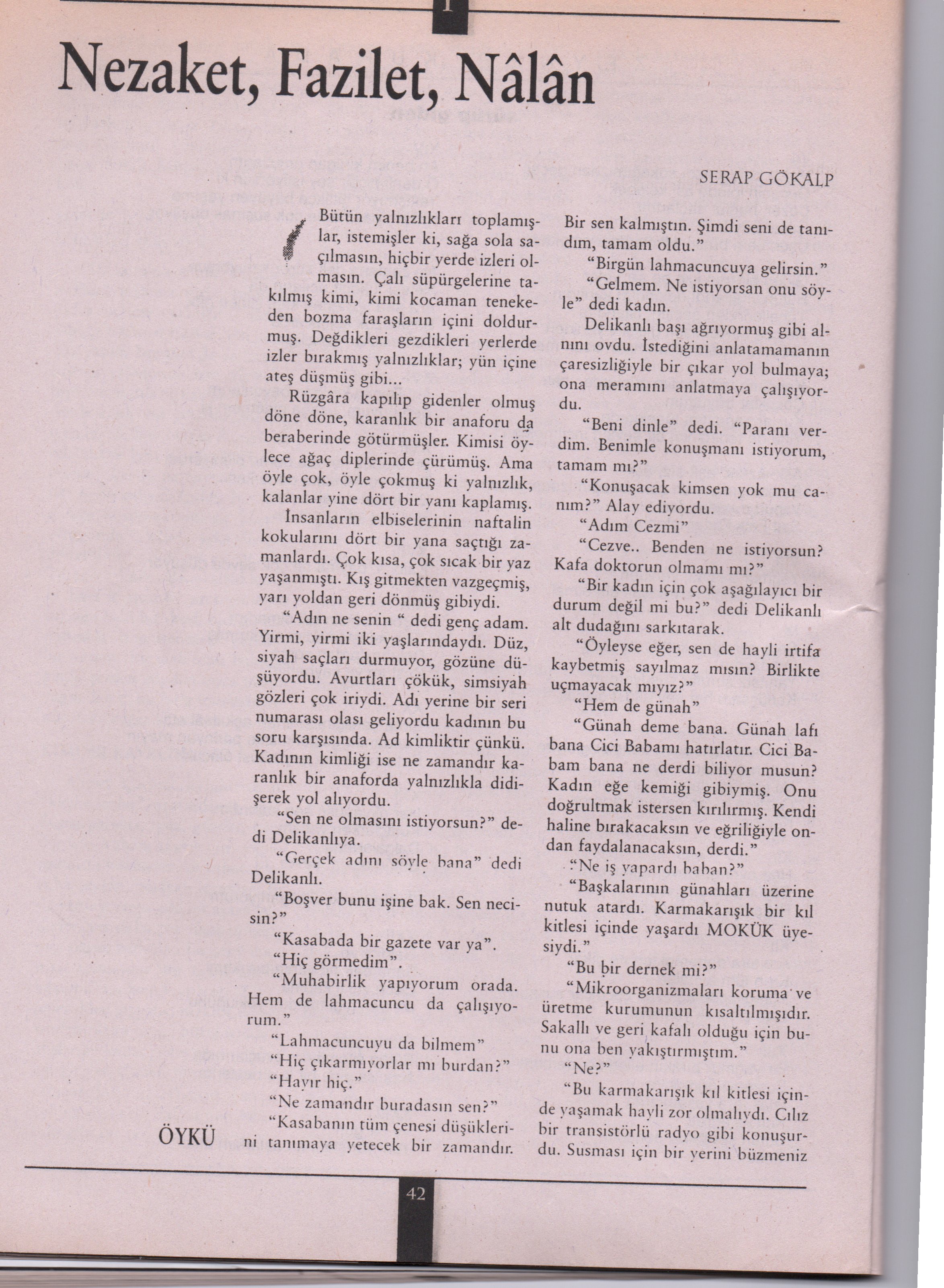 Mart 2001 49.sayıda üç kız kardeşin öyküsü var. Adlarının Nezaket, Fazilet ve Nâlân, olduğunu öğreniriz. Öykü bir genelevde kasabanın gazetecisi (ki gündüzleri lahmacuncuda çalışmaktadır) ve bir hayat kadınının konuşmasıyla başlar. Kadını ikincil gören zihniyetlere başkaldıran, bunu din kavramına kafa tutan bir hayat kadınıyla yapar öykü. Üvey babasının tacizine uğramış, bunu içine gömmüş bir kız çocuğunun on bir yaşında evden kaçmasıyla başlayan yaşam öyküsünü, gazeteciye anlatan hayat kadını, üç kız kardeşten Nezaket’in ırzına geçildiğini, Fazilet’in bir cinayete kurban gittiğini, kendisinin de burada olduğunu haykırır. Nâlân (anlamı, inleyendir) sağ kalmıştır ama… Din motiflerinin kadını yok eden din kavramlarının üzerine kurgulanmış bu öykü, gazeteci delikanlının odayı terk etmesi ve kadının arkasından bağırmasıyla biter: “Kadın kapanan kapıya sordu: Havva kaburga kemiği ise, Adem kaburga kemiği ile yatıyorsa, Adem kime tecavüz etmiş oluyor? Kaburga kemiği kötü yola düşerse, kötü yol kaburgalı ya da kaburgasız Ademlerin yoluysa, hangi günahlar kimin olacak? (Daha çok bağırdı) Ha aklıma gelmişken, benim adım Nâlân!”