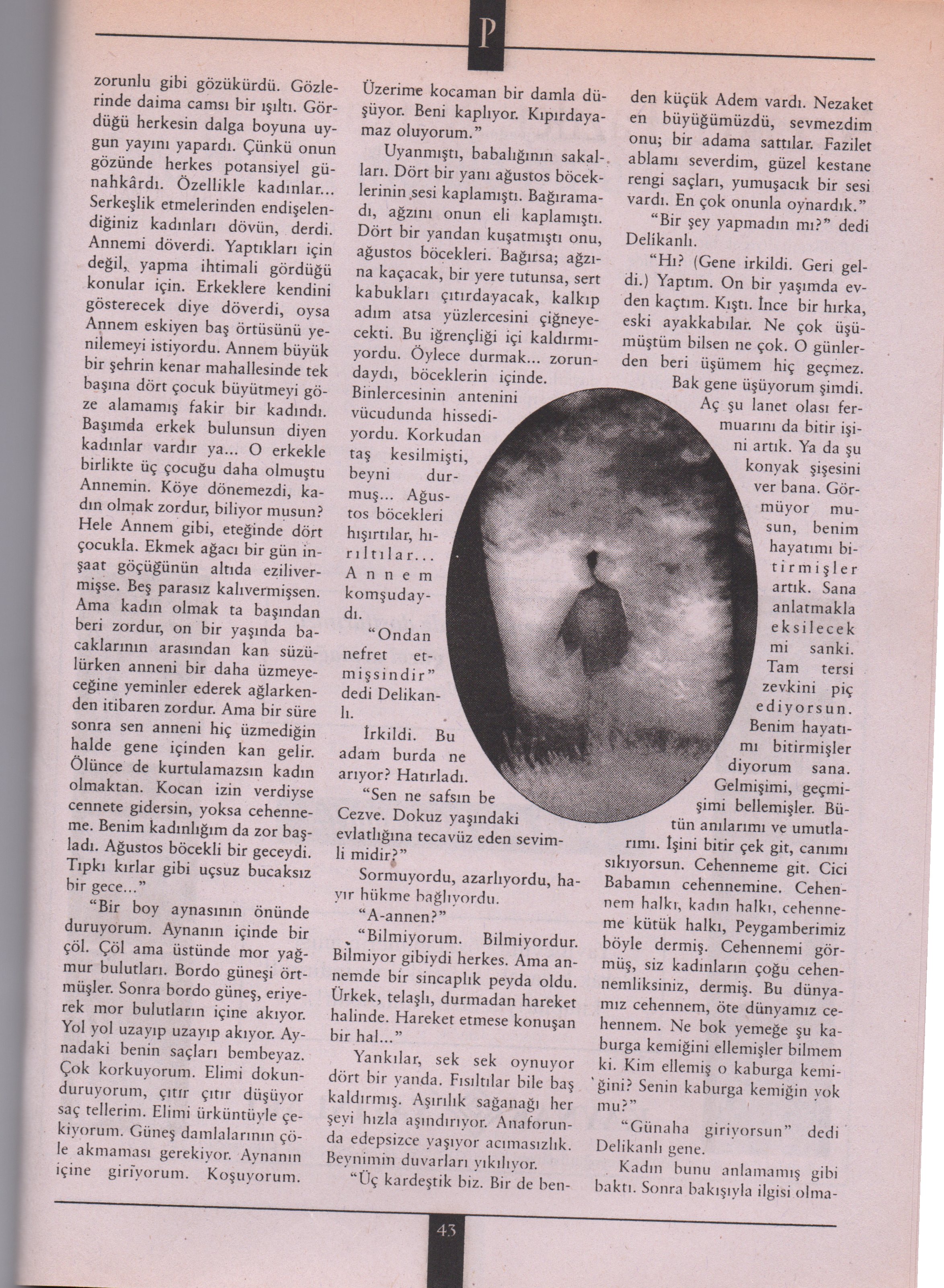 “Hastaneye gitmek için daha erkendi. Sonra çayı demlemek için mutfağa gitmişti. Sonra sabunun üzerindeki saçlarına kızmıştı kocası, sonra kadın sabah sabah gönlünü yapmasına rağmen neden kocasının kızdığını sormuştu adama, sonra kocası banyodan çıkmış saçını ellerine dolamış… sonra…sonra…sonra… “Ah yeter artık vurma!” Sonra gene… gene…gene…Gene sonra… sonra… Sandalyenin üstüne düşmüştü. Başını vurdu. Bu onu tarifsiz öfkelendirdi. Demek böyle, diye mırıldandı. Hastaneye gitmek için evden çıkması gerekiyordu o sıra. Masanın üstündeki mermer vazoyu belinden yakaladı. Beyaz mermer kıpkızıl olana dek vurdu, vurdu, vurdu. Sonra adamın avucunun içine kilitlenip kalmış saç tutamını açık ağzına tıktı. İşte bu kadar! Hastaneye gitmekten vazgeçti. Bugün kadınlar yalnız başlarına doğurabilirlerdi!”
