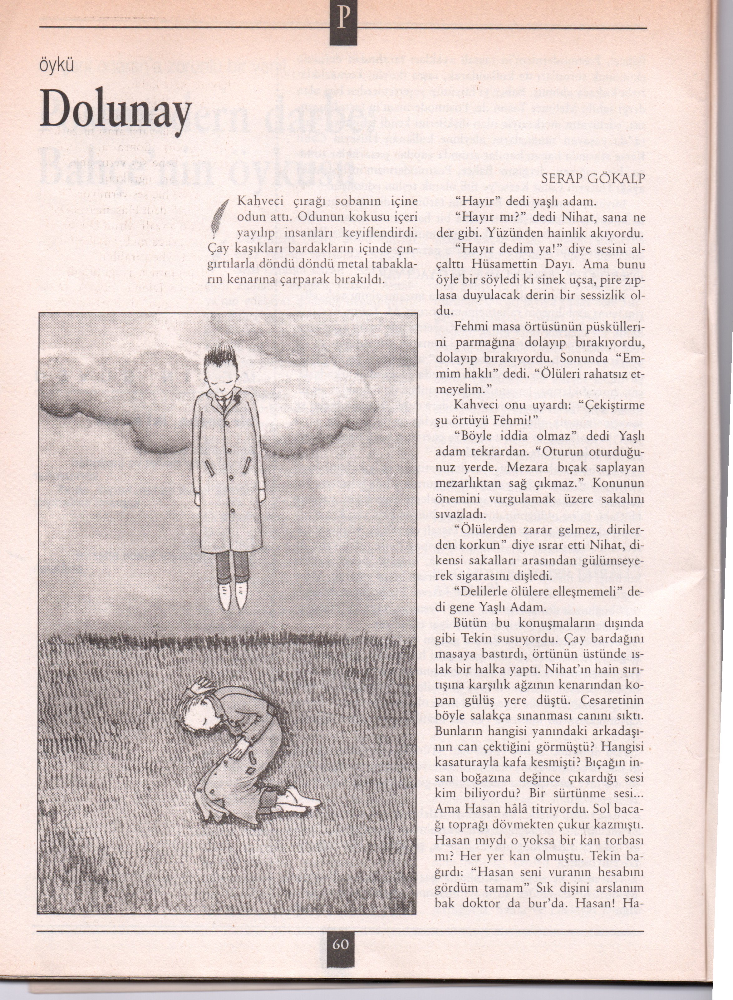 Papirus’un 39.sayısında (Mayıs 2000) Dolunay adlı öyküm yayımlanmış. Batıl inançlar üzerine kurgulanmış, köy kahvesinde bir iddiayla başlayıp köyün mezarlığında biten bir dizi küçük olayla şekillendirilmiş bir öykü Dolunay. Kahve dışında açık alanda geçiyor. Mevsim kış. Askerden yeni dönmüş kahramanın batıl inançlarla savaşmak için gösterdiği çaba ama koşullandırılmışlığın etkisinden de kurtulamayıp trajediyle sonlanması. Adı Tekin olan baş karakterin “tekinsiz” iddianın kurbanı oluşunda kendi dağarcığındaki korkularına yenik düşmesidir. Betimlemelerinin zenginliğiyle, okurun canlandırmasına kapılar açan bu öyküden bir seçki: “Kapı açılınca, basıla basıla betonlaşmış toprağın üstüne bir ışık düştü. Karşıdan soğuk rüzgârın sesi ve köpek havlamaları geliyordu. Kahvenin ışığı binanın dışına sarı bir leke gibi sarktı. Toprağın üzerinde yayılıp eridi.”