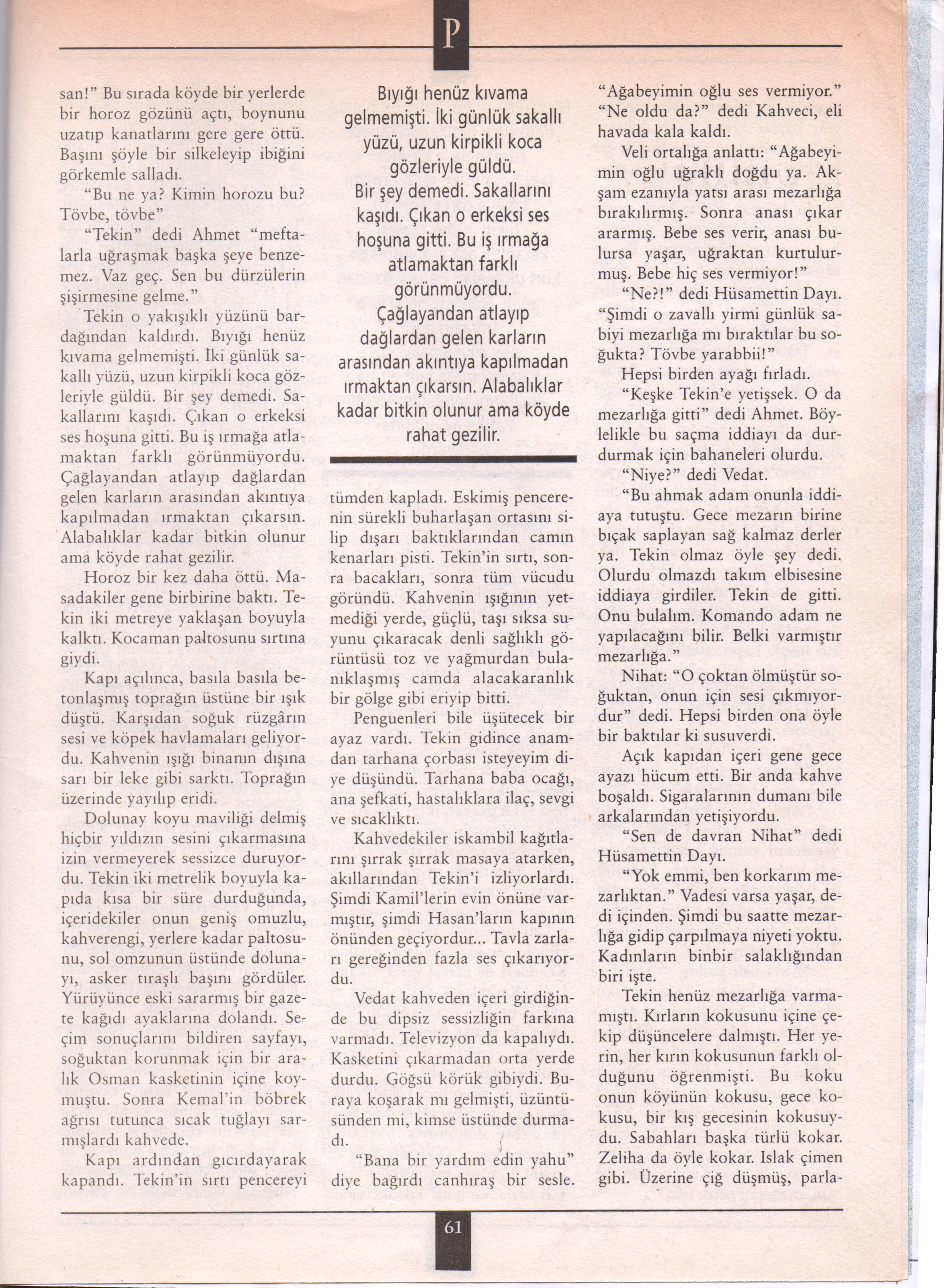 (…)“Kahvedekiler iskambil kağıtlarını şırrak şırrak masaya atarken, akıllarından Tekin’i izliyorlardı. Şimdi Kâmillerin evin önüne varmıştır, şimdi Hasanların kapının önünden geçiyordur… Tavla zarları gereğinden fazla ses çıkarıyordu.”