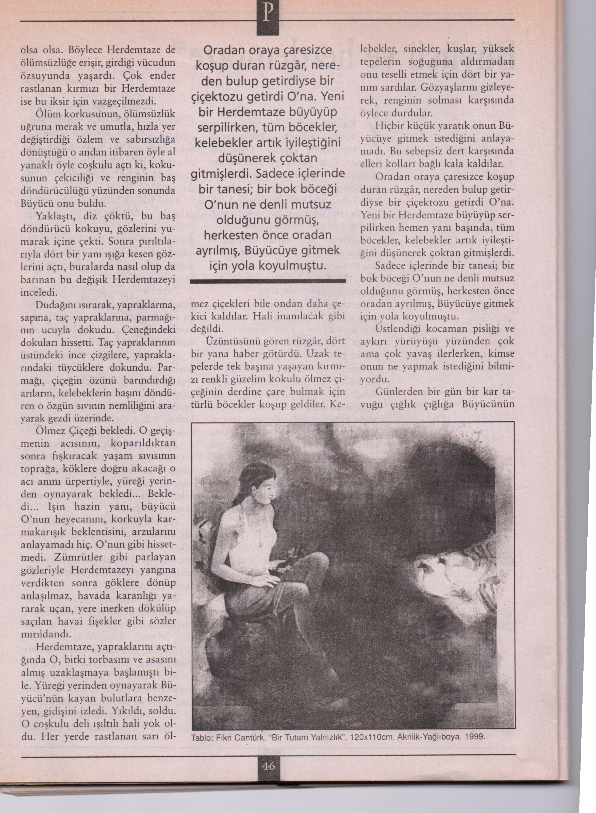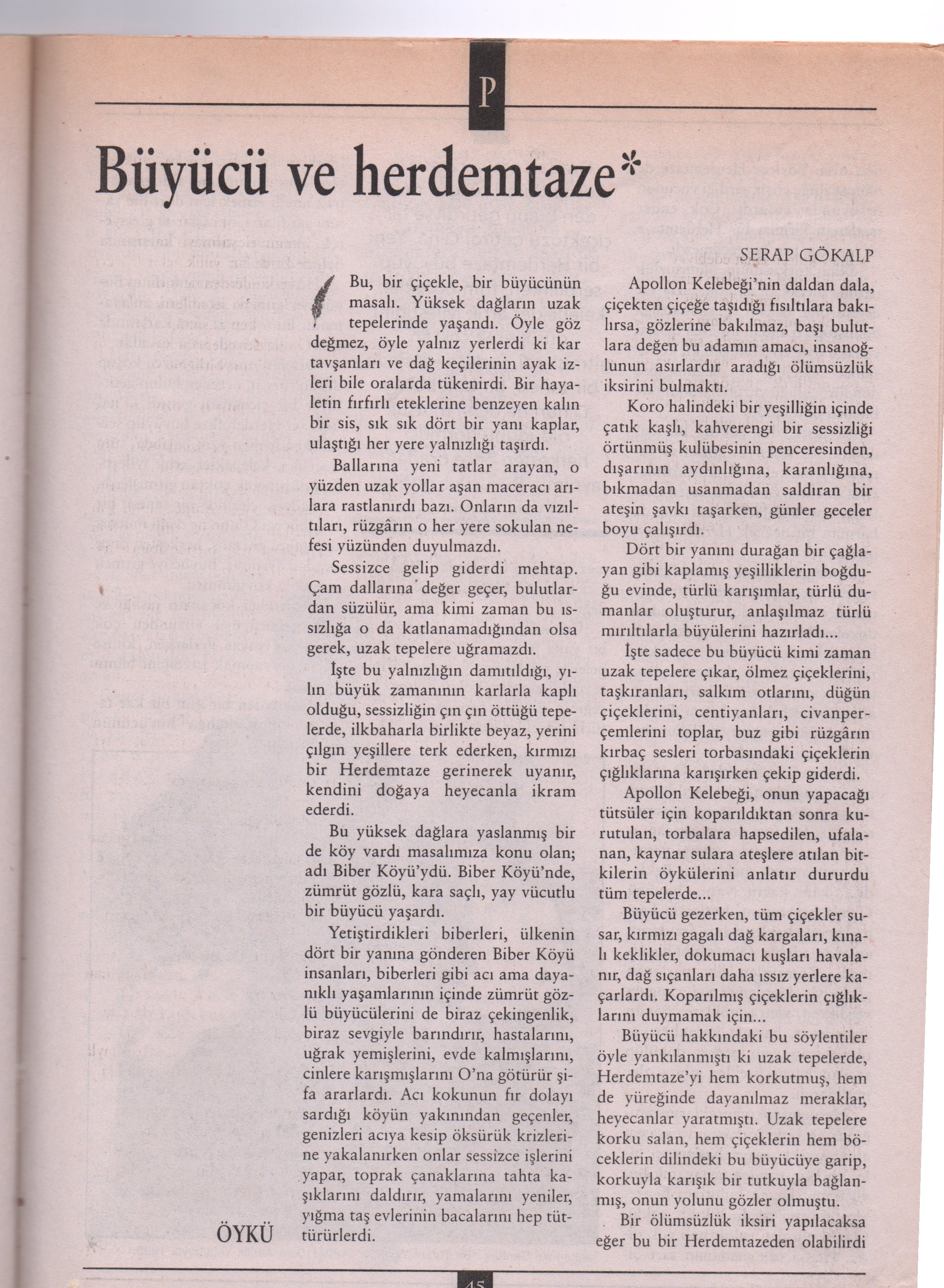 Papirüs Dergisinin Şubat 2000’de, 36.sayısında yer alan öykü eril karakter olarak Büyücü , dişil karakter olarak herdemtaze bitkisi üzerinden anlatılan bir aşk öyküsüdür. Masalsı anlatımı ve metaforlarıyla tutku kavramı, tutkunun bireyler üzerindeki dönüştürücü etkisi üzerinde çalışır. Helichrysum sanguineum bitkisi Türkçesi herdemtaze, diğer adıyla ölmez çiçek, genellikle sarı renkte ve çok ender kırmızı renkte olan her mevsimlik bir dağ bitkisidir. Kurutulduğunda bile rengini kaybetmeme özelliği vardır. Bu özellikleri nedeniyle “kadın” için kullanılmıştır. Öyküde ölmez çiçeğin yaşadığı yer şöyle anlatılır; “İşte bu yalnızlığın damıtıldığı, yılın büyük zamanının karlarla kaplı olduğu, sessizliğin çın çın öttüğü tepelerde, ilkbaharla birlikte beyaz, yerini çılgın yeşillere terk ederken, kırmızı bir herdemtaze gerinerek uyanır, kendini doğaya heyecanla ikram ederdi.” Herdemtazenin özelliklerinden hareketle kadına gönderme yapan yalnızlık duygusu şöyle tanımlanır: “Öyle göz değmez, öyle yalnız yerlerdi ki kar tavşanları ve dağ keçilerinin ayak izleri bile oralarda tükenirdi. Bir hayaletin fırfırlı eteklerine benzeyen kalın bir sis, sık sık dört bir yanı kaplar, ulaştığı yere yalnızlığı taşırdı.”