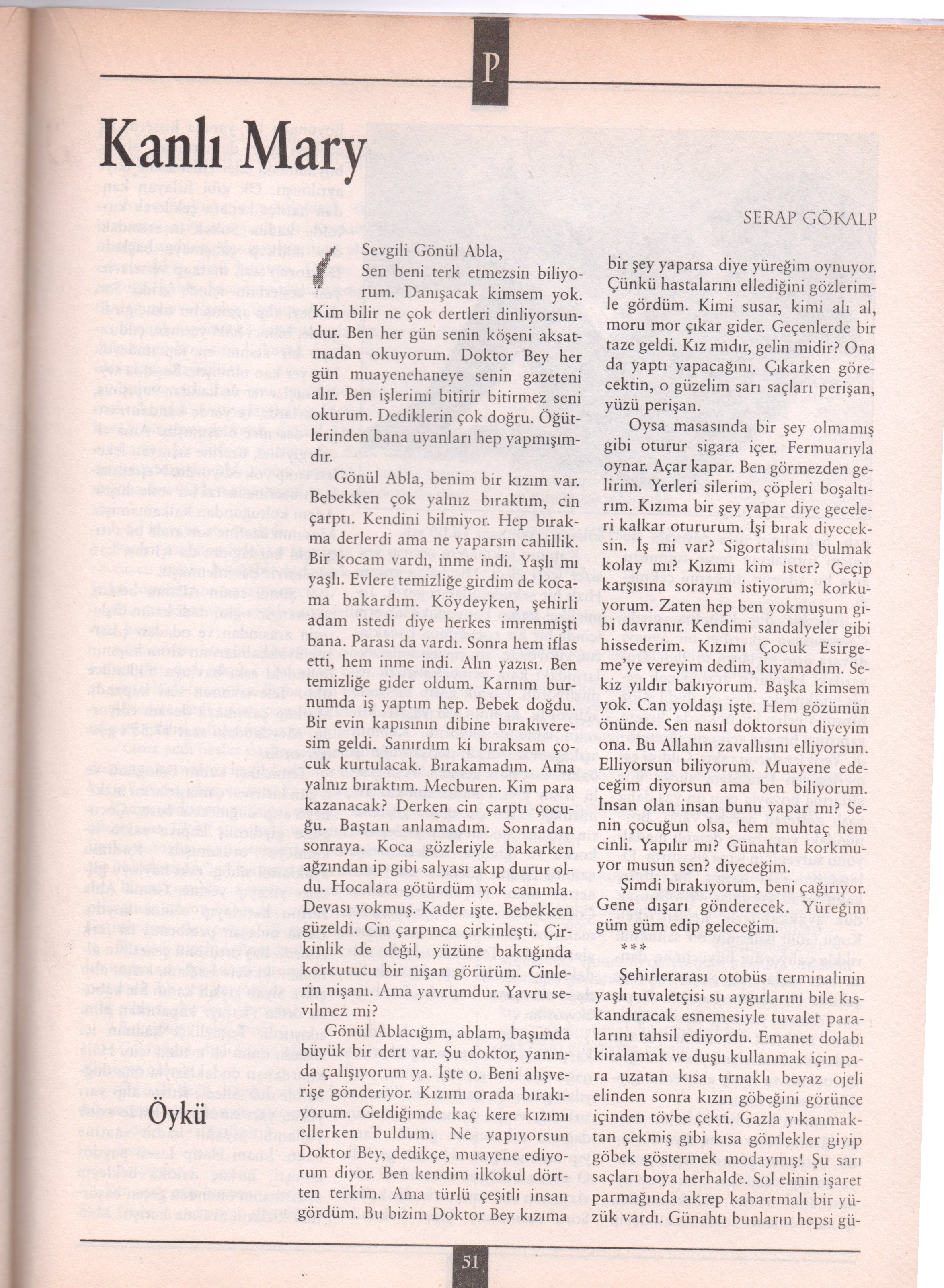 Temmuz 2000’de 41.sayıda Kanlı Mary var. Bu öykü kadın, çocuk tacizine eğilen bir öykü.