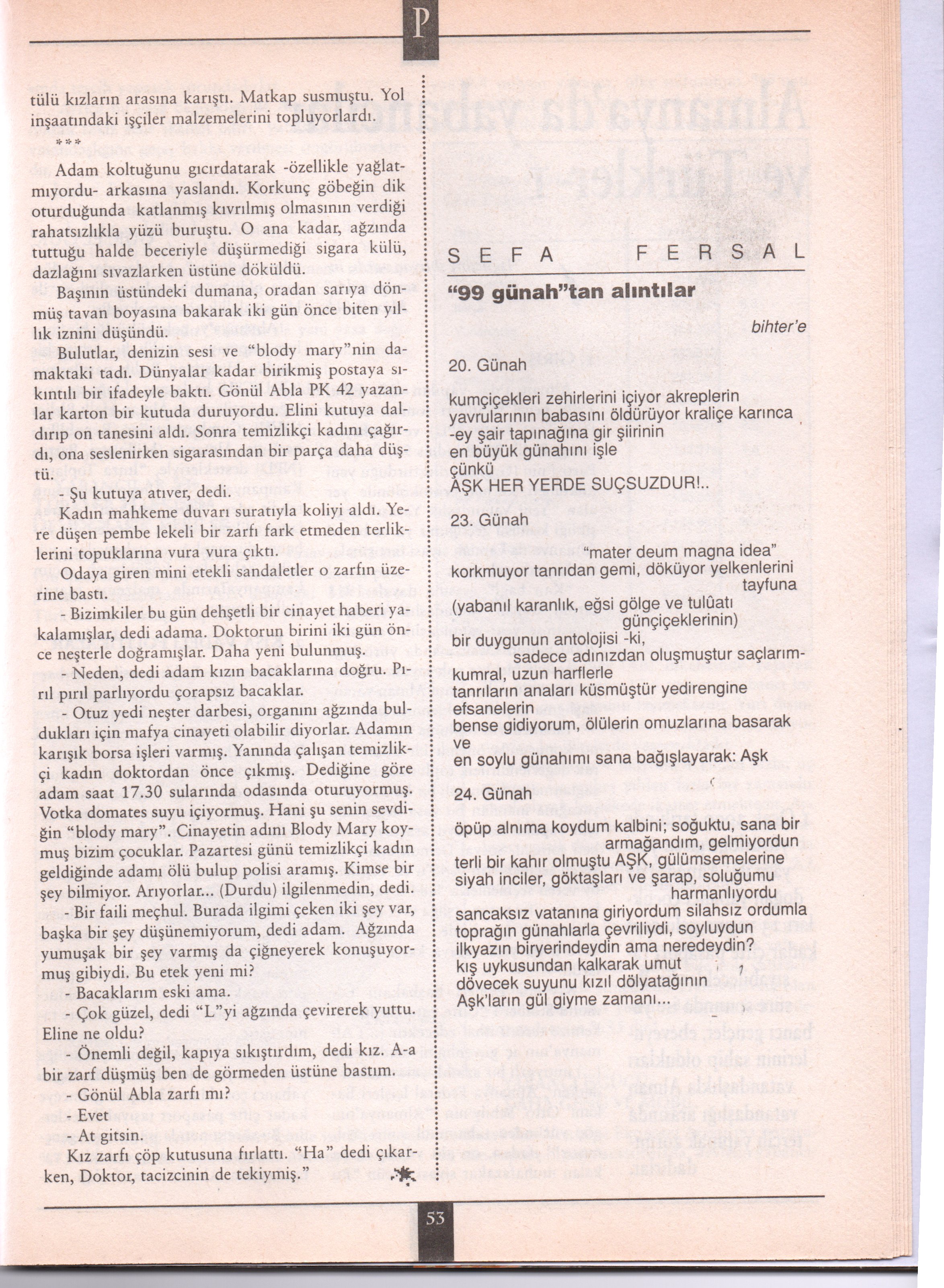 Derginin iç kapağında Selda’nın Türkülerimiz 3 kasetinin reklamı var. “Vurulduk Ey Halkım Unutma Bizi” başlığında. Arka dış kapakta ise Turan Dursun’un 4 Eylül 1990’da katledilişinin yıldönümü için siyah zemin üzerine fotoğrafının yer aldığı bir anma sayfası tasarlanmış. “Ben yüzyılların doğurduğu ölümüm,” demişti. Çaktığı kıvılcım şeriatçı karanlığı boğan aydınlanma ateşine dönüştü, notuyla.