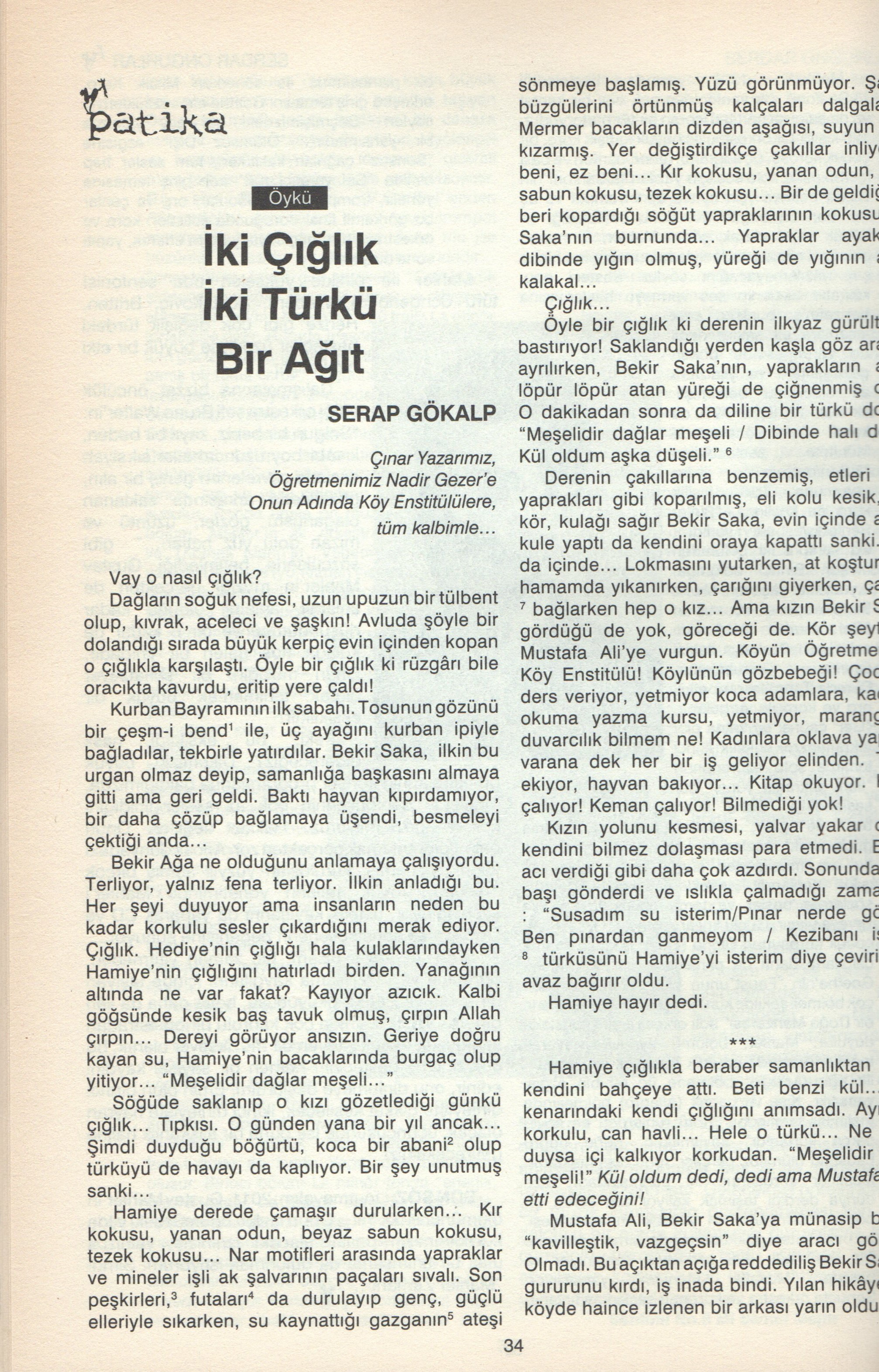 İki Türkü İki Çığlık Bir Ağıt öyküm de Kulak Misafiri kitabımda yer almış, aynı zamanda bir tiyatro oyununa dönüşmüştür. Bu öyküyü çok seven yazar dostum Buket Başaran Akkaya’yla harika bir çalışma süreci yaşayarak oluşturduğumuz aynı adlı oyunu çok severek yazdık. Ama bu zevkli çalışmanın kaderi iyi olmadı ne yazık ki.  Devlet Tiyatroları repertuarına alınan oyun o gün bu gündür raflarda tozlanarak sahnelenmeyi bekliyor. İşte o öyküden de tadımlık bir ayrıntı. “Vay o nasıl çığlık? Dağların soğuk nefesi, uzun upuzun bir tülbent olup, kıvrak, aceleci ve şaşkın! Avluda şöyle bir dolandığı sırada büyük kerpiç evin içinde kopan o çığlıkla karşılaştı. Öyle bir çığlık ki rüzgârı bile oracıkta kavurdu, eritip yere çaldı!” Bu öyküde iki genç kıza, bir Köy Enstitülü Öğretmene, bir saplantılı aşka rastlarsınız. Geleneklere, geleneklerin gölgesinde bir öç alışa tanık olursunuz. Gelenekleri ve yöresel sözcükleriyle oluşturulan atmosfer 40’lı yılların Bursa’sına bir bakıştır.