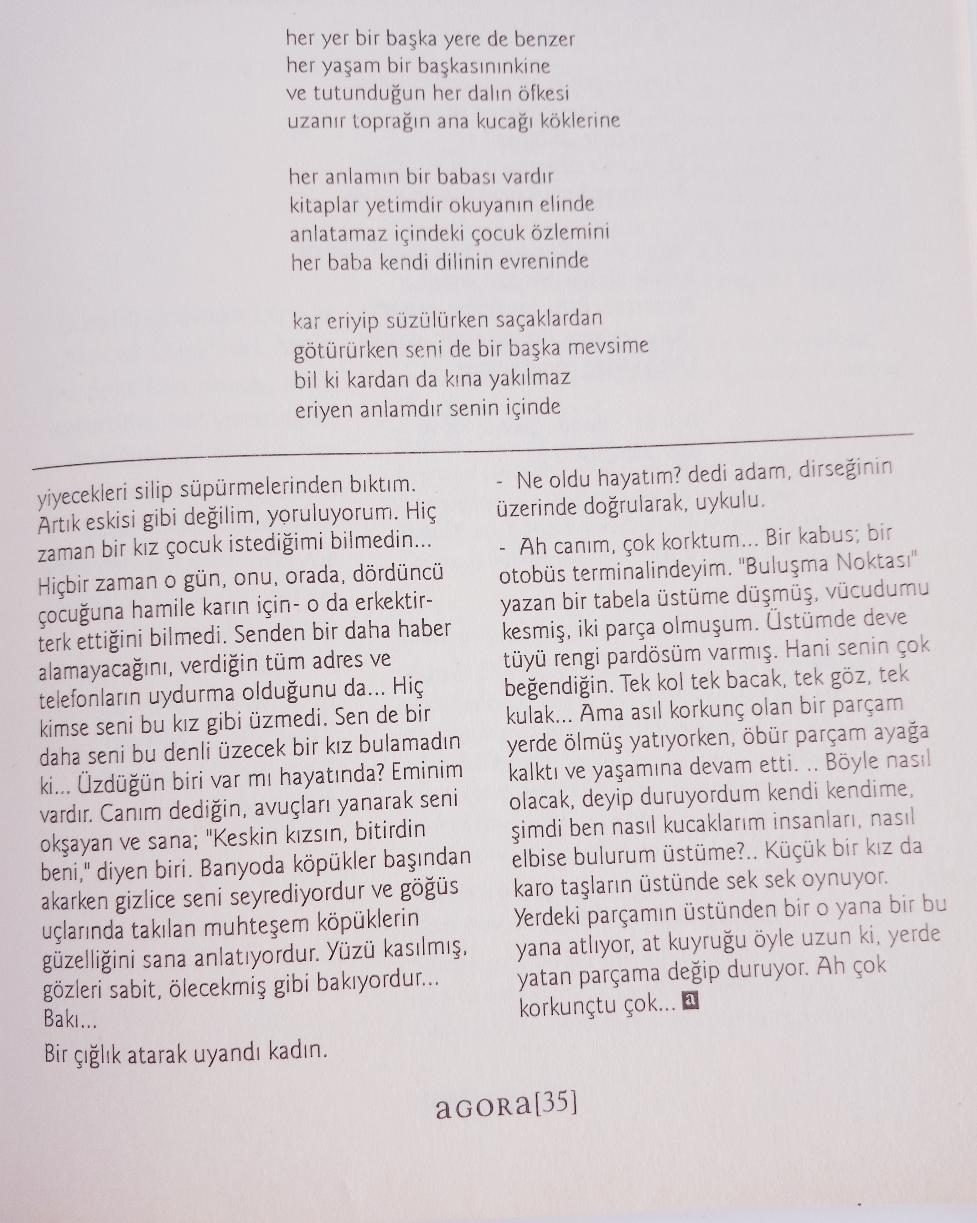Hem içsel hem dışsal anlatımlarda -ki bunlarda denge vardır- her an çoklu bakış açısıyla okumayı sağlıyor. Yazarın çok mercekli algılayıcılarının olduğunu düşündürdü bana. Anlatıcının ben seslenişi ilginç bir dönüşüm, değişimi vurgulamak için üçüncü tekil şahsa dönüyor ilerleyen sayfalarda… Ben anlatımı anlatım kolaylığı ve geniş alan açmaktadır yazara.