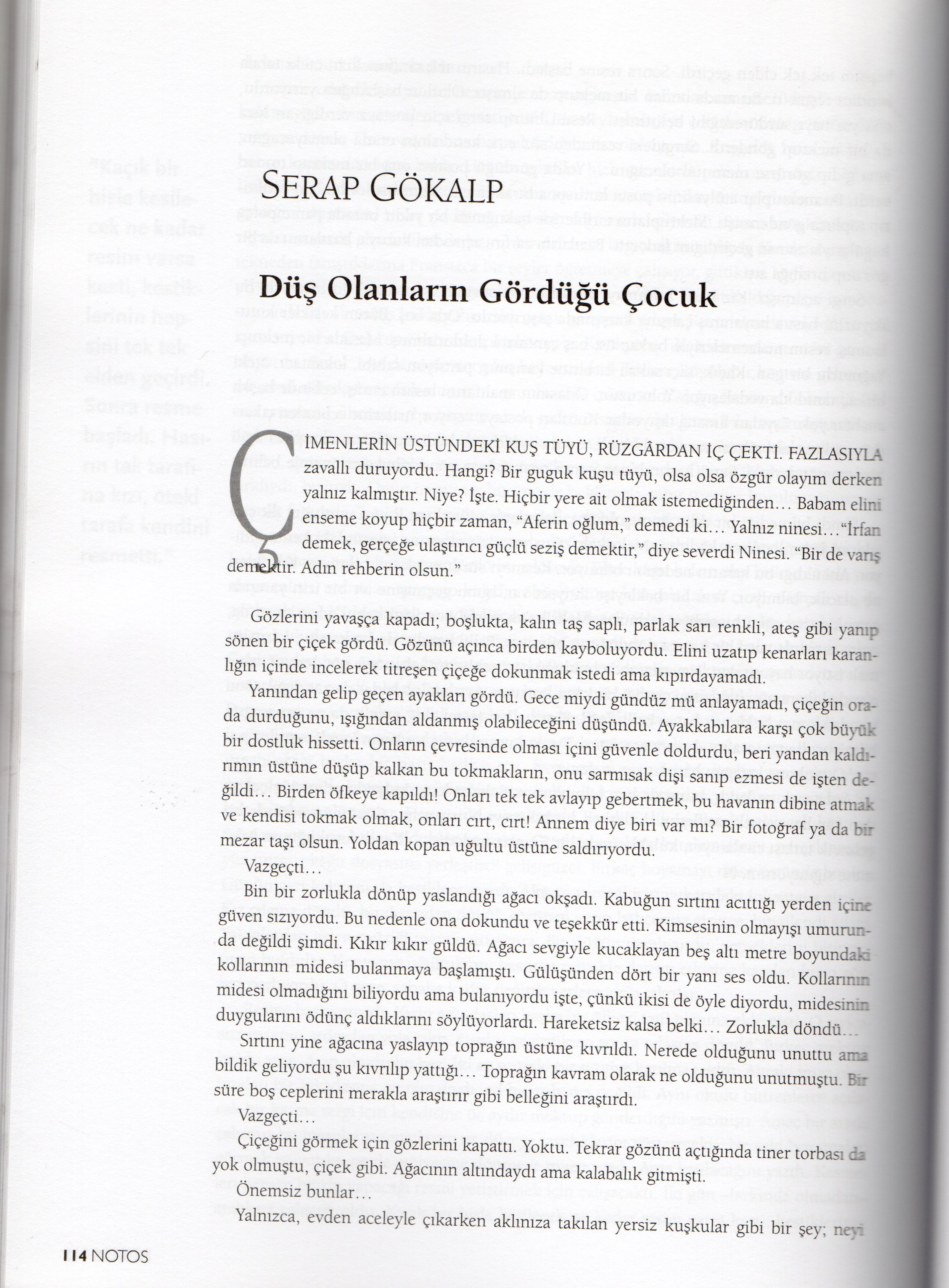 Bu mevsimde tümüyle ıssızlaşan adada tek tük yanan ışıklar parlak delikler gibiydi. Her adımda onlar titreşiyor ayakları yerinde duruyor hissi veriyordu insana. Karaltı çukurlara girdikçe ışıklı delikler hızlıca yer değiştiriyordu. Tarif edilen evin perdeleri açık penceresinden dalların gölgeleri odanın duvarlarında titreşiyordu. Sobada çatlayan kozalakların sesi dışarıdan duyuluyor, yarattığı güvenli sıcak alanda yaşlı bir adamla bir kadın oturuyordu. Kafeste bir kanarya uyukluyordu. Bu görüntüye bakınca odayı reçine kokusunun kapladığını hayal edebiliyordun.